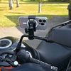 Základom je robustná objímka tyče spätného zrkadla, ktorá je vhodná pre priemer 8 - 14 mm a môže sa použiť aj na iné okrúhle rúrky (napr. na tyč riadidiel). Na svorku nadväzuje 40 mm dlhé rameno, ktoré sa otáča o 360°, čo vám dáva priestor na presné nastavenie dosahu a uhla pohľadu. Dva kĺby s krídlovou maticou umožňujú rýchle nastavenie presnej polohya jej bezpečné zaistenie, takže telefón zostane tam, kde má - aj na nerovnom teréne.